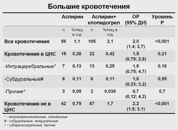 На фоне двойной антитромбоцитарной терапии отмечалось увеличение частоты больших кровотечений: